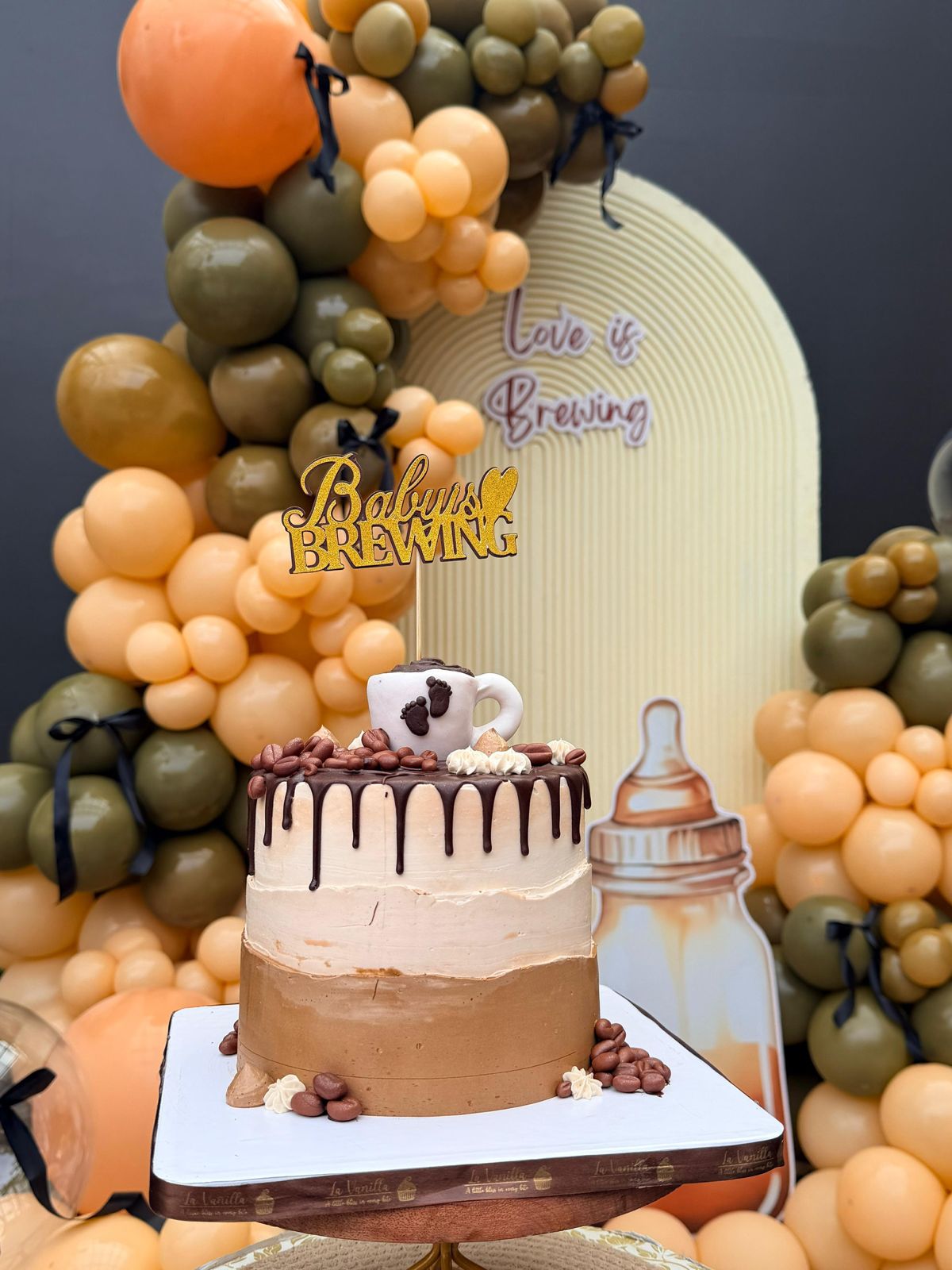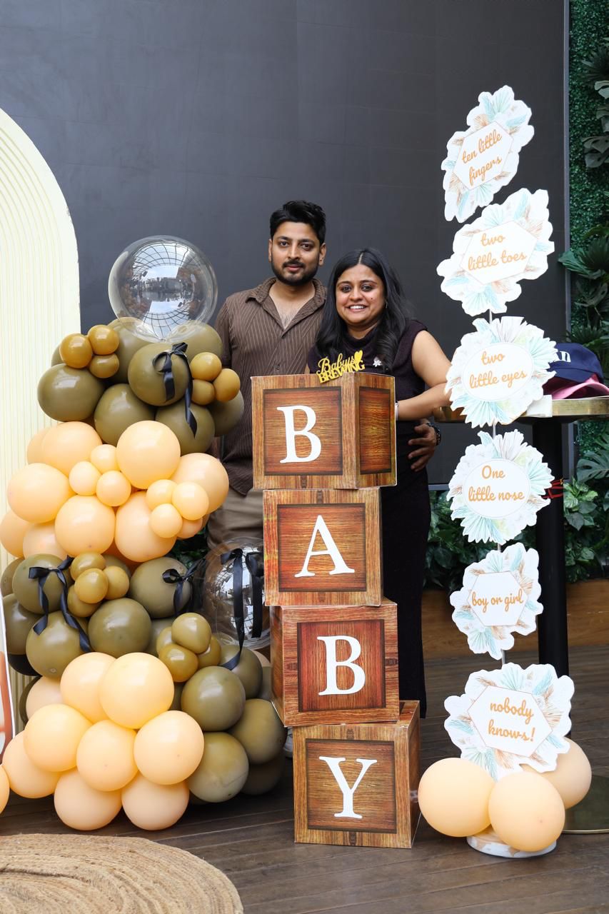 A warm, earthy-toned baby shower setup designed for intimate home celebrations. Featuring a structured wooden backdrop with layered balloon artistry and styled elements, this design creates a beautiful focal point for photographs and cake cutting.