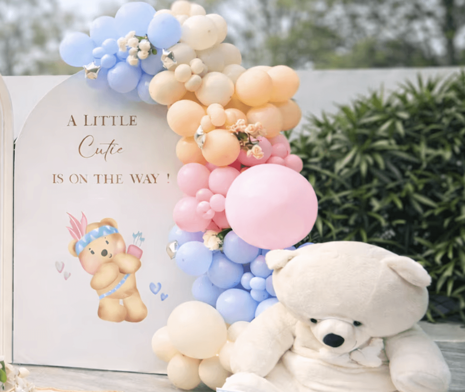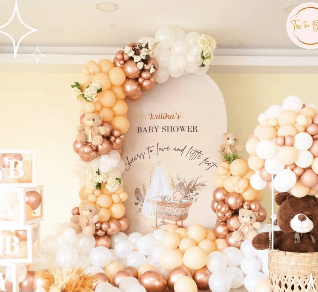 Featuring a premium arched backdrop, layered balloon artistry, teddy accents, and a personalized welcome panel, this décor creates a charming focal point for photographs, cake cutting, and memorable moments with family and friends.