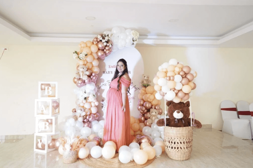 Celebrate the arrival of a little one with a beautifully styled baby shower setup in soft peach, ivory, and rose-gold tones.